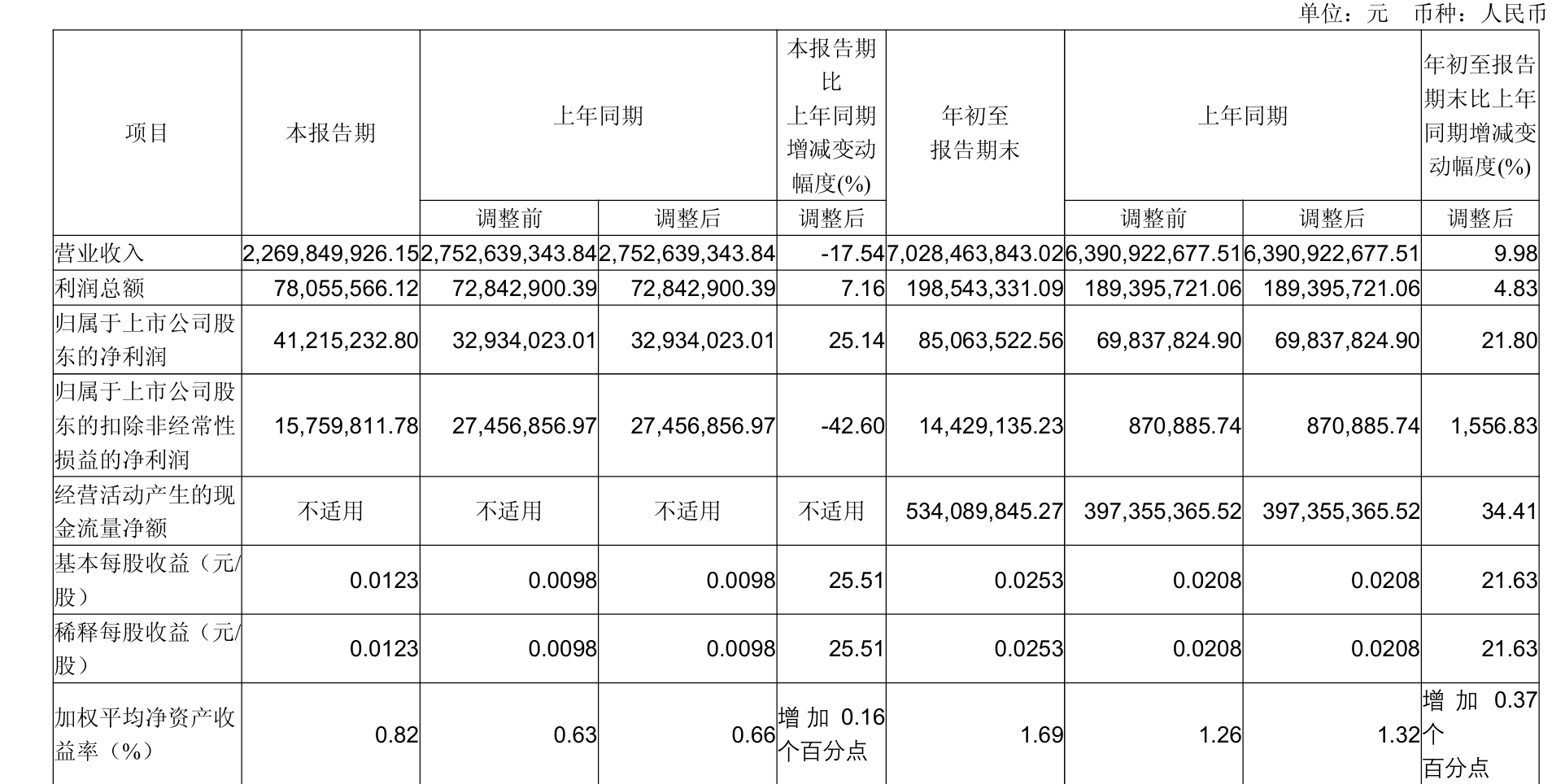 其中,公司第三季度实现营业收入22.7亿元,同比下降17.54%;归母净利润4121.52万元,同比增长25.14%;但其扣非净利润仅为1575.98万元;同比下降42.60%。