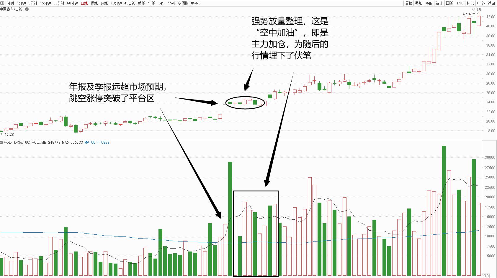 如图2-1所示为中通客车(000957)走势图,在业绩超预期的利好刺激下,该股以跳空涨停突破长期平台,随后在涨停价附近展开为期两周的放量整理。这种\"空中加油\"式的整理平台,既消化了短期获利盘,又为主力提供了加仓机会。对于投资者而言,识别这种形态的关键在于确认整理期间的量能配合和价格抗跌性,在平台区间介入往往能获得较好的风险收益比。
